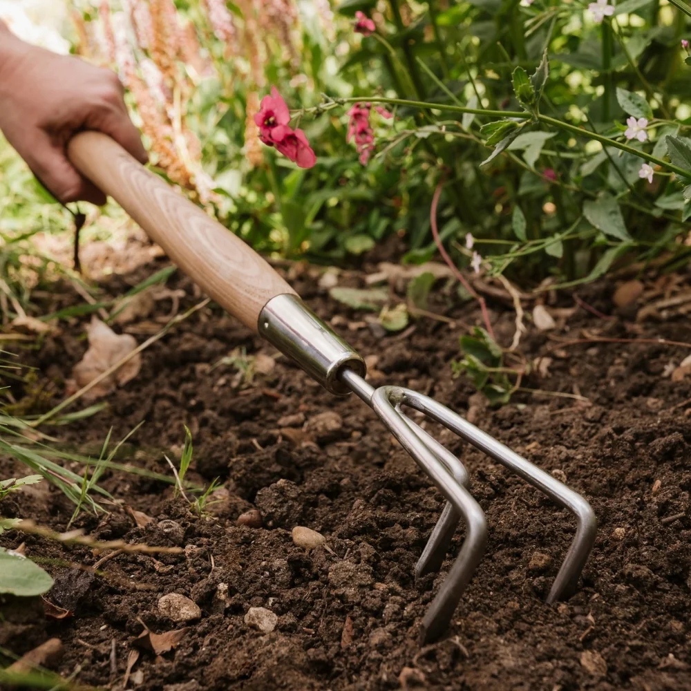 Its narrow, sharp tines effectively loosen soil, remove weeds between flowers, and aerate the ground to promote healthier plant growth. It is also excellent for mixing in soil improvers to enhance soil quality. Crafted from high-quality stainless steel, the cultivator is rust-resistant and easy to maintain, while the FSC® certified ash wood handle ensures durability and comfort during use.